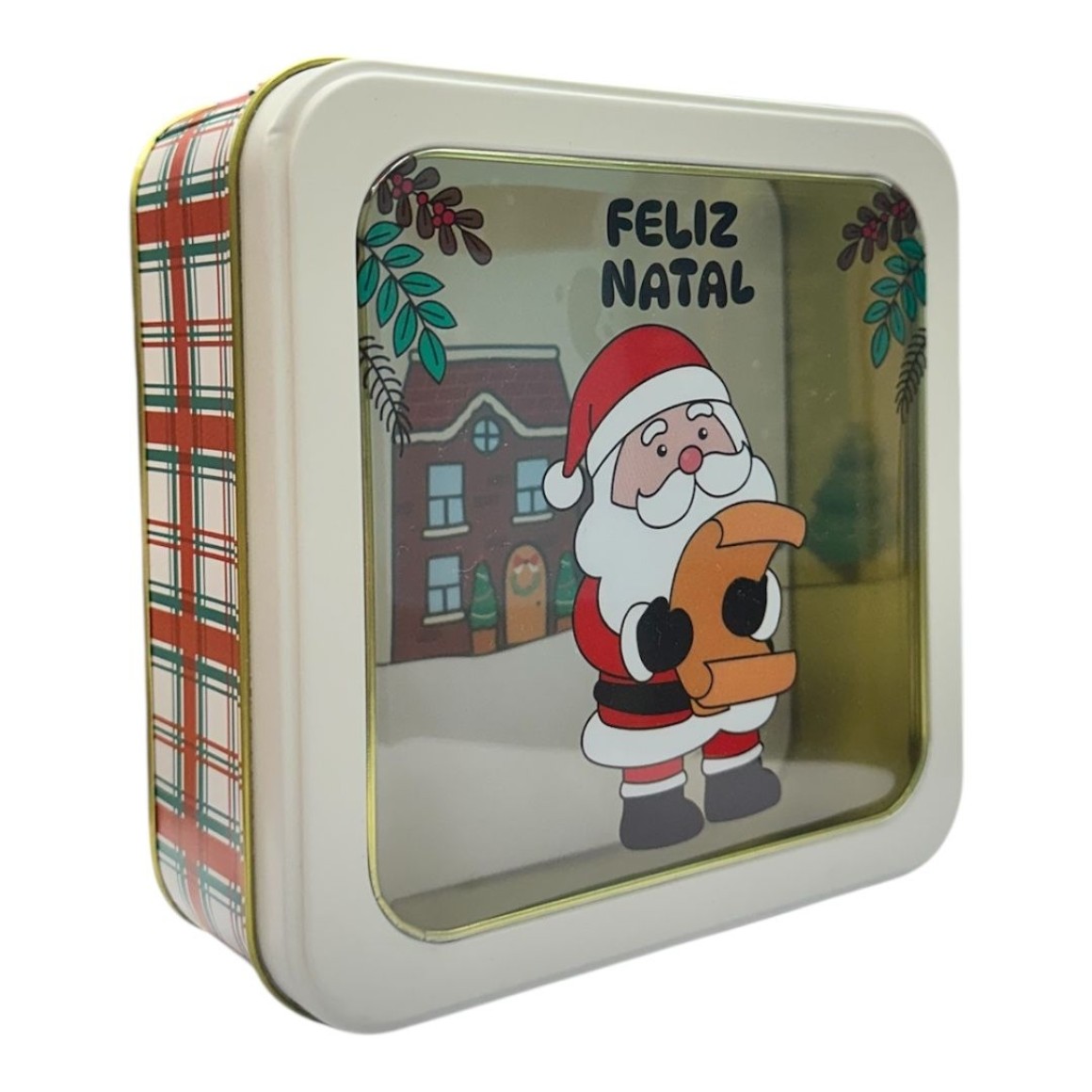 Lata de metal quadrada com temas natalinos.