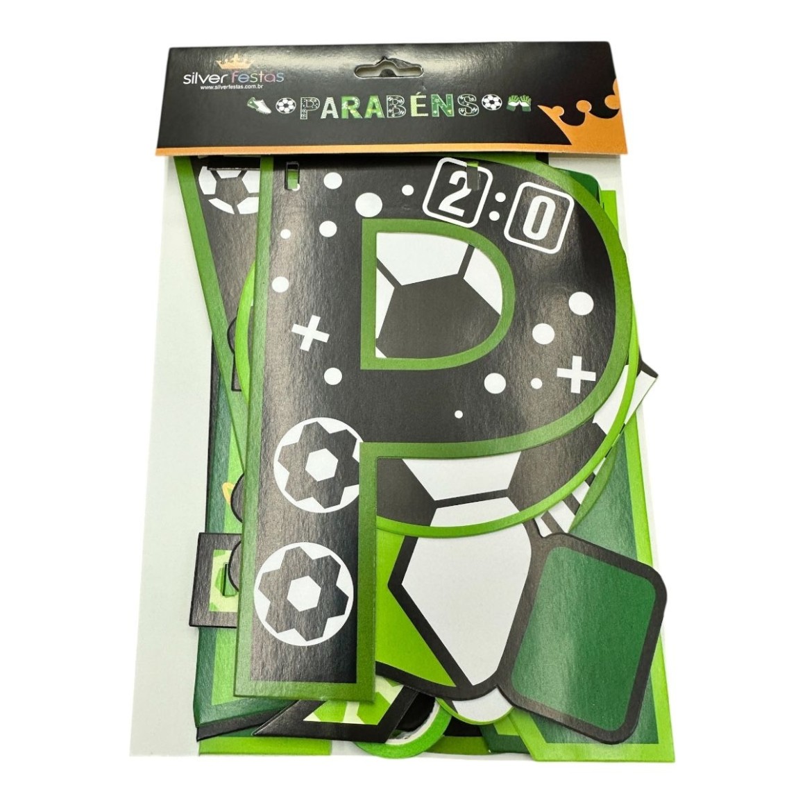 Faixa contendo 8 letras, 2 bolas, 1 chuteira e 1 par de luvas, todos feitos de papel, pronto para pendurar e enfeitar sua festa futebol.