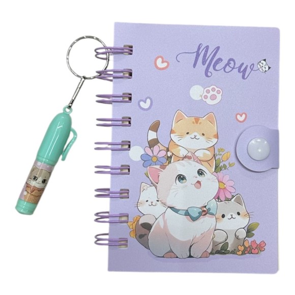 Acompanha mini caneta fixada com argola no espiral do bloco.