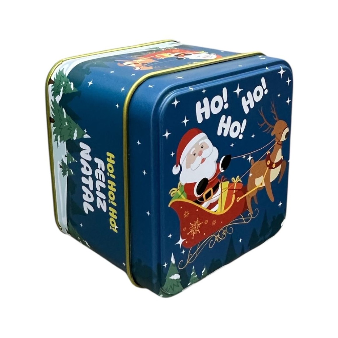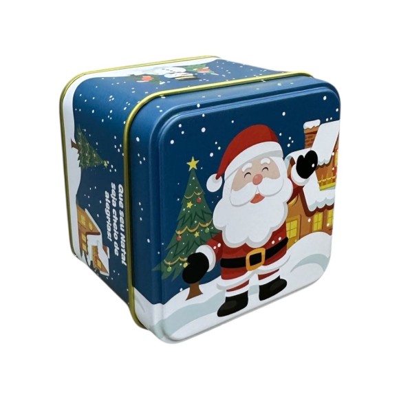 Lata de metal quadrada com temas natalinos.